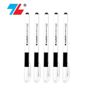 Thân và nắp bút bằng nhựa trắng đục, in nhũ kim loại.